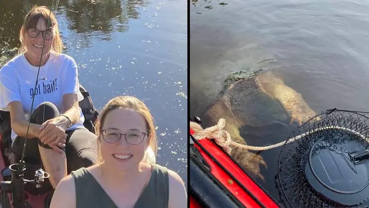 Shala later described how quickly the situation escalated once the turtle approached. Its nose appeared first, gliding through the water toward them, and then more of its body became visible. The closer it came, the larger it seemed. What had first looked like a shadow soon turned into a massive animal moving with confidence and ease beneath their kayak. Then, in a move that made the encounter even more intense, the turtle went directly for their fishing basket.