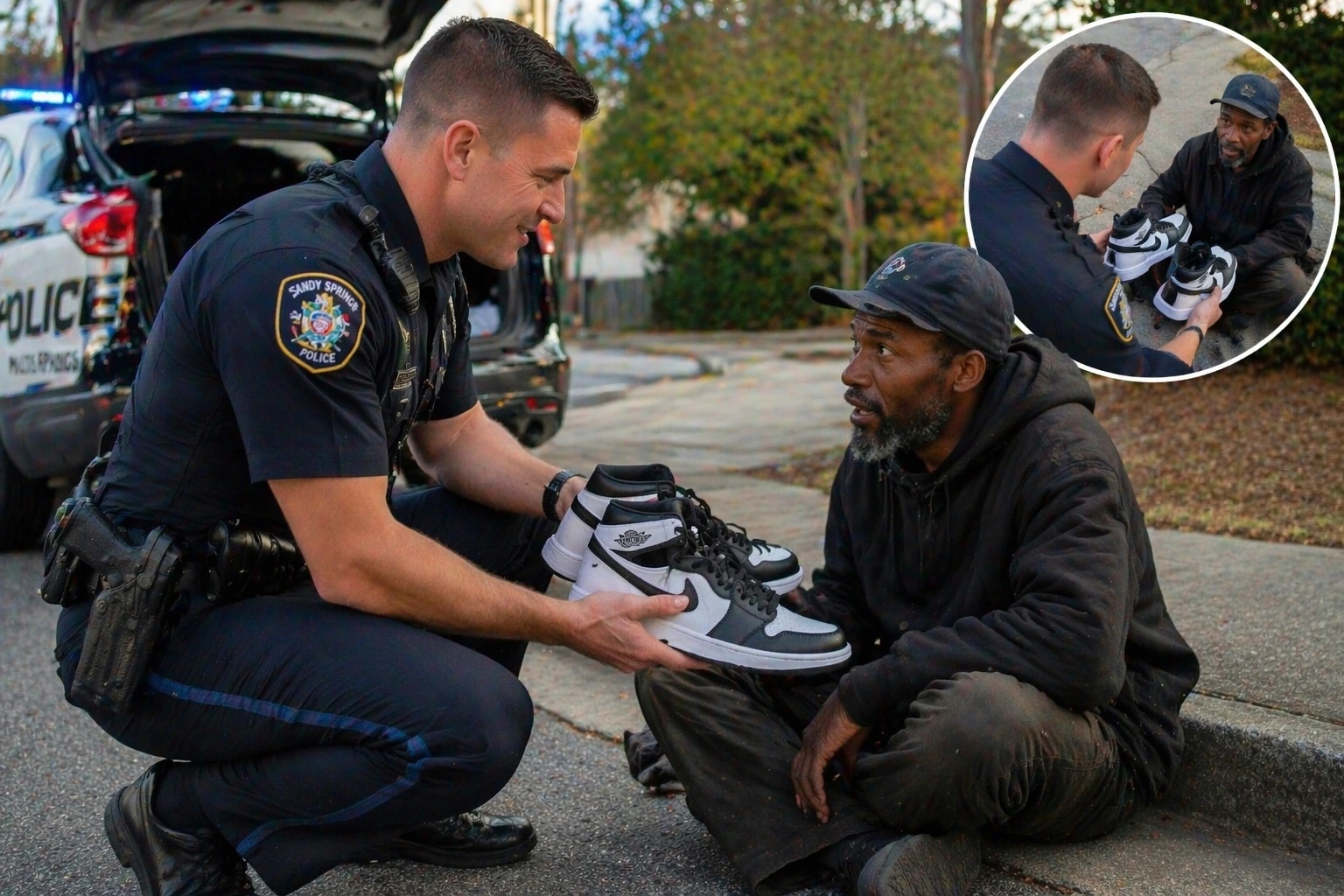 In Sandy Springs, a police officer was caught on body camera doing something no one had asked him to do and something he likely never expected would draw attention. During his shift, he stopped to help a man in need and quietly gave him a pair of shoes from the trunk of his patrol car. The moment was later shared by the Sandy Springs Police Department and quickly resonated with viewers because of how simple and genuine it felt.